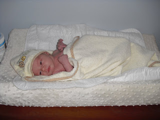 His umbilical cord fell off yesterday so I was planning on bathing him this weekend. Since he peed all over himself and me and his pack and play, we decided a bath tonight would be a good thing. He hated every minute of it. But right afterwards, our sweet boy was happy.